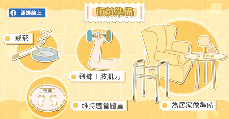 術後恢復期間活動力較弱,可以趁手術前先把居家環境整理一下,找人來大掃除也好。如果本來空間安排上需要走樓梯上樓才能回房休息,就要考慮看能不能找到有一樓可以住的地方,或是找到可以用電梯上下樓的棲身處。