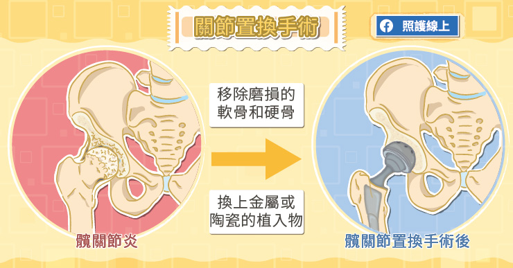置換關節的手術時間約是幾個小時。醫師會先移除患者關節腔裡被破壞的軟骨、硬骨,再換上塑膠、金屬、或陶瓷等不同材質的植入物。這些植入物會與原本骨頭的形狀相似,模擬自然關節的活動樣貌。請看下圖了解髖關節炎和髖關節置換後的樣子。