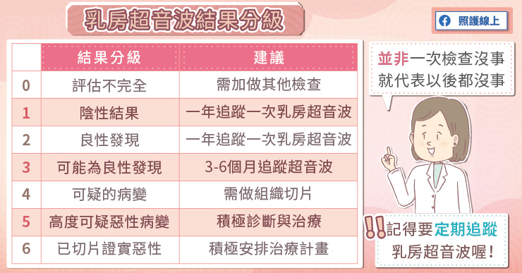 還有另外一個分級則是第0級,這代表在超音波下有些問題需要其他影像檢查的輔助才能做出正確判斷,通常得到這樣結果的人需要去加做個乳房攝影
