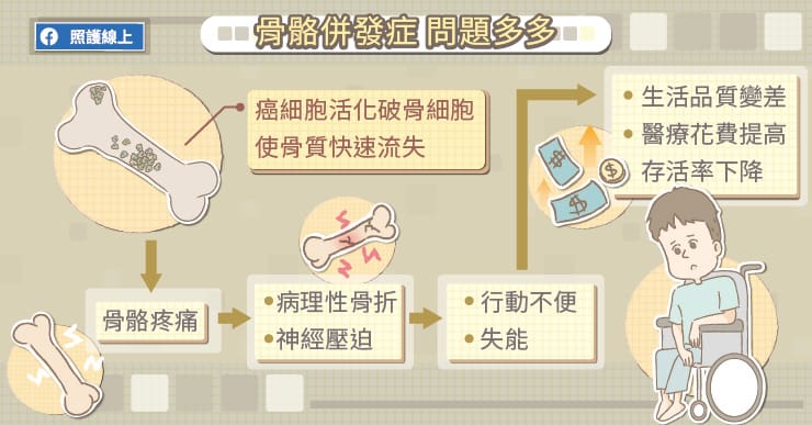 隨著醫療科技發展,今日癌友的存活期越來越長,維持癌友良好生活品質以及預後成效,也成為重要的治療目標之一。然而,由於癌症容易發生骨轉移,會造成原本強而有力的骨骼變得脆弱,隨之而來的病理性骨折將會導致癌友行動受阻,社交、工作都將被迫中止;若不幸發生癱瘓,不僅身體機能退化,還可能打斷治療計畫、影響預後。