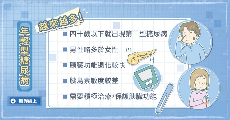 「大概十個患者中會有一個屬於年輕型的糖尿病,其中男性患者佔的比例較高,」曾耀賢醫師說:「現在年輕型糖尿病患者不僅人數變多,還有個特色,就是這群患者的胰臟功能退化比較快,胰島素的敏感性比較不好,需要積極介入治療,趕緊把血糖控制下來的族群,傳統降血糖藥物也不容易維持血糖穩定,早期積極合併治療或新一代降血糖藥物是保護胰臟功能的策略。」