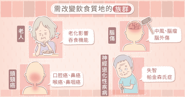 在嬰兒4~6個月時,父母開始逐步給予副食品,不僅可以訓練孩子的咀嚼、吞嚥能力,體驗食物的美味。然而,飲食質地上的調整,不僅只有小嬰兒,當年紀逐漸增長,吞食的功能也可能開始出現障礙。導致吞食功能障礙的原因很多,包括影響腦神經功能的中風、腦瘤、腦部創傷、失智、神經退化疾病等,或是影響口腔咽喉結構的口腔癌、鼻咽癌、喉癌等,隨著年紀增長,吞食功能也可能逐漸退化。