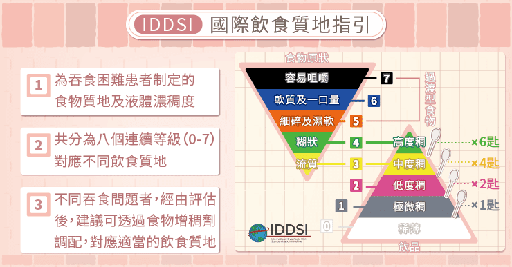 國際吞嚥困難飲食標準(IDDSI)共分為八個連續等級(0-7),每個等級皆有相對應的文字與顏色做區分。等級0是稀薄,如一般的飲水、等級1是極微稠、等級2是低度稠、等級3是中度稠(流質)、等級4是高度稠(糊狀)、等級5是細碎及濕軟、等級6是軟質及一口量、等級7是容易咀嚼。家屬可以藉由筷子、叉子、針筒等常見物品,檢測食物質地與液體濃稠度,滿足不同吞食困難程度患者的需求。