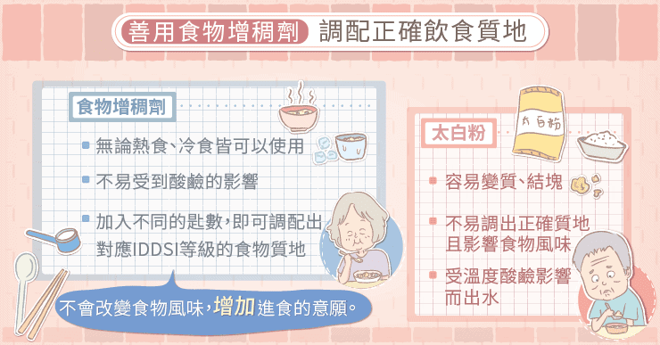 在過去,為避免嗆咳,照護者多會嘗試使用太白粉、番薯粉等以增加食物的濃稠度。但此種做法較容易影響食物風味,降低食慾。且較不穩定,可能隨著時間、溫度等而改變食物狀態,發生結塊、出水等問題,使得進食容易不安全。