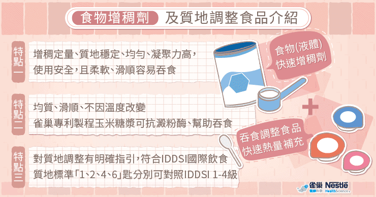 此外,使用無色無味的食物增稠劑,也不會改變食物風味,可增加患者進食的意願,除了有助改善營養狀況,更可提升長輩生活品質與樂趣。