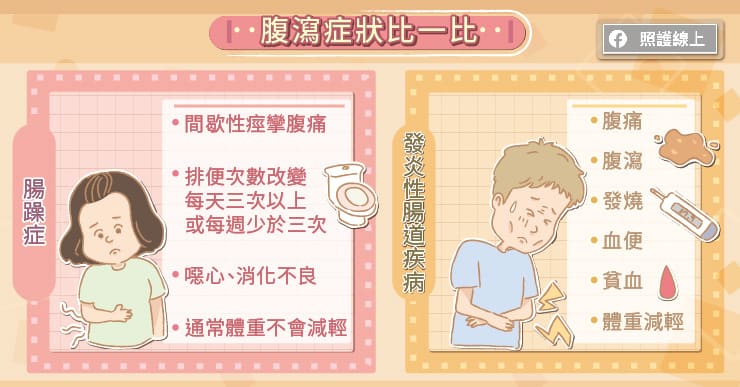 肝膽胃腸科鍾承軒醫師說明,慢性腹瀉、慢性腹痛是大腸激躁症與發炎性腸道疾病共同臨床表徵,但若同時合併血便、體重變輕,或腸道外病癥,如眼睛虹彩炎葡萄膜炎、脊椎關節痛、皮膚炎等現象時,可能就要懷疑不是單純的腸躁症,而可能是發炎性腸道疾病的表現,如未及早確診就醫治療,可能延誤病情,甚至發生相關併發症,例如:腸穿孔、狹窄阻塞或廔管而需要外科開刀治療。