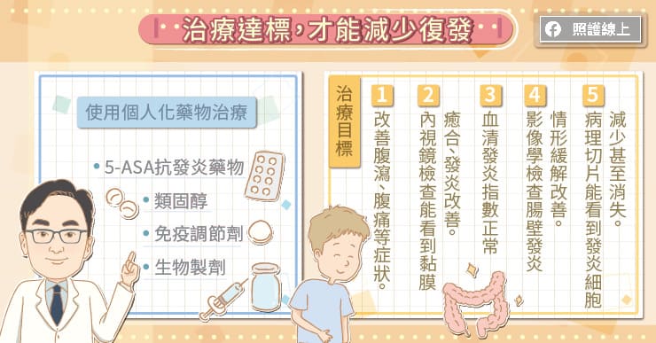 隨著治療藥物進步以及發炎性腸道疾病的發展及變化因人而異,以潰瘍性結腸炎為例,依據患者拉肚子及血便的發生頻率、搭配內視鏡檢查結果及身體狀況等項目來評分,加總後區分為輕度、中度、重度,醫師會根據患者病情調整藥物組合,擬定個人化醫療策略。