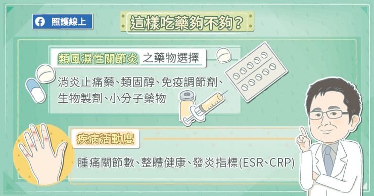 使用的治療藥物並非一成不變,隨著腫痛關節數目、僵硬程度、整體健康狀況、發炎指標的變化,皆需適時調整藥物。