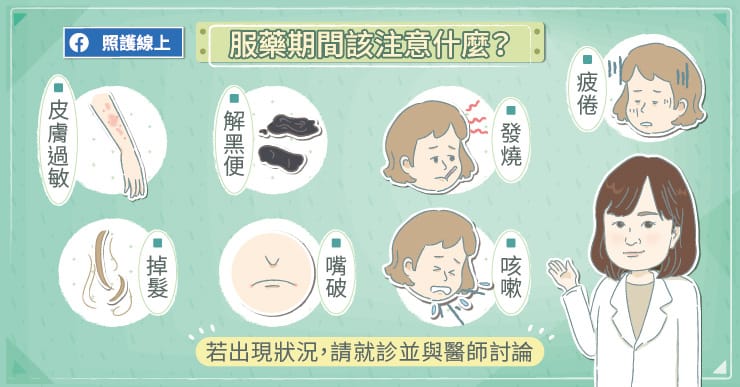 另有一些常見的狀況,如掉髮、嘴破、皮膚過敏等,可能與藥物有關,回診時可以主動提出來與醫師討論。