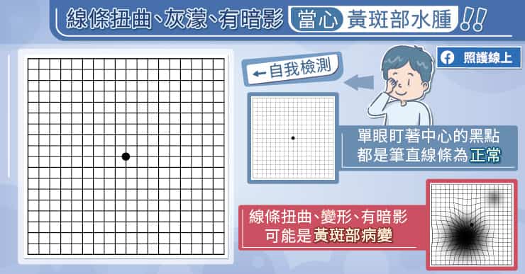 大家可以使用電腦螢幕做個初步的測試,先遮住一隻眼睛,用另一眼盯著方格圖的中心點,正常狀況下應該會看到筆直線條,倘若看起來線條扭曲、變形、有暗影,便可能是黃斑部病變,要盡快就醫。
