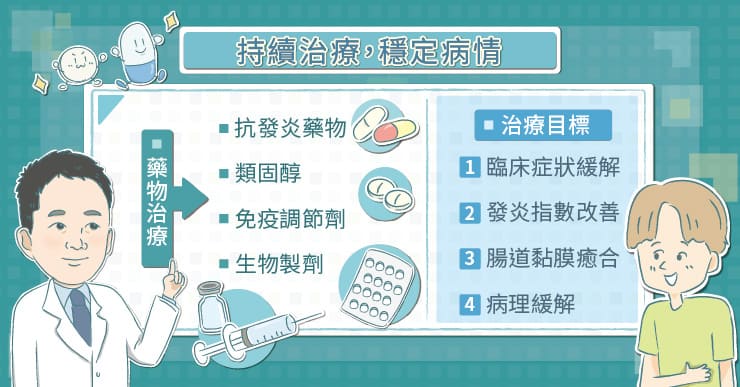鄭以勤醫師指出,臨床針對發炎性腸道疾病治療目標有四,第一、臨床症狀緩解,改善腹瀉、血便頻率;第二、發炎指數回復正常;第三、促進腸道黏膜癒合,降低復發風險;第四、達到病理緩解,長期穩定控制病情。