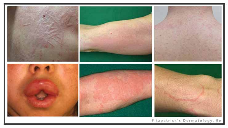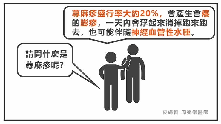 蕁麻疹俗稱「起凊膜」,會產生會癢的紅色或白色膨疹,一天之內會浮起來消掉跑來跑去,因此也叫做「風疹」或「風團」;也可能伴隨神經血管性水腫,好發在眼皮、嘴唇或是手腳長,嘴唇腫起來很像香腸嘴,厲害的神經血管性水腫甚至會腫到氣管,造成呼吸會喘的狀況,也可能會腫到腸胃道,產生拉肚子的症狀。