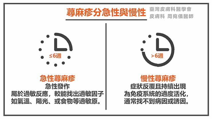 急性蕁麻疹(發作時間≤6週):急性發作,屬於過敏反應,較能找出過敏因子如氣溫、陽光、或食物等過敏原。