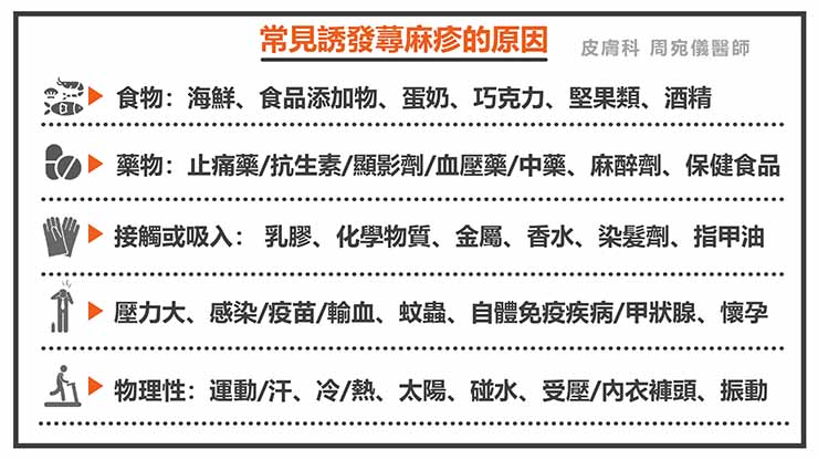 誘發或惡化蕁麻疹的原因有很多,每個人都不一樣,在急性蕁麻疹與慢性誘發性蕁麻疹比較有辦法觀察到誘發原因,但六成慢性蕁麻疹患者其實是屬於慢性自發性蕁麻疹,很難找到原因。
