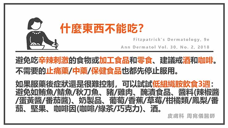 在蕁麻疹門診最常被問到的問題就是到底有什麼東西不能吃,一般來說建議避免吃辛辣刺激的食物、加工食品和零食、建議戒酒和咖啡。不需要的止痛藥、中藥和保健食品也都先停止服用,等狀況穩定可以在醫師評估後再一樣一樣加回去,如果每次加某一樣就發起來就別再吃了。