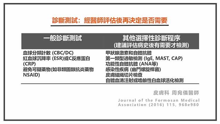 是否需要抽血或做更進一步的檢查,需經醫師評估病史與臨床症狀後,有需要才需要檢測,一般是為了能辨識誘發因子並排除其他可能的疾病如自體免疫或甲狀腺疾病。
