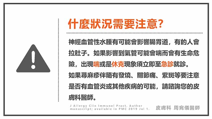 如果蕁麻疹伴隨有發燒、關節痛、紫斑等要注意是否有血管炎或其他疾病的可能,請諮詢您的皮膚科醫師。