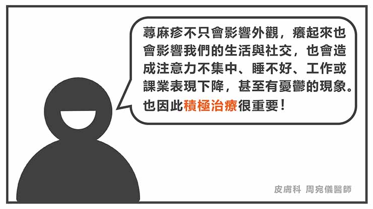 蕁麻疹不只會影響外觀,癢起來也會影響我們的生活與社交,也會造成注意力不集中、睡不好、工作或課業表現下降,甚至有憂鬱的現象。也因此積極治療很重要!
