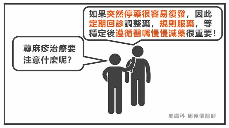 如果突然停藥很容易復發,因此定期回診調整藥,規則服藥,等穩定後遵循醫囑慢慢減藥很重要,不然很快就再發起來了!