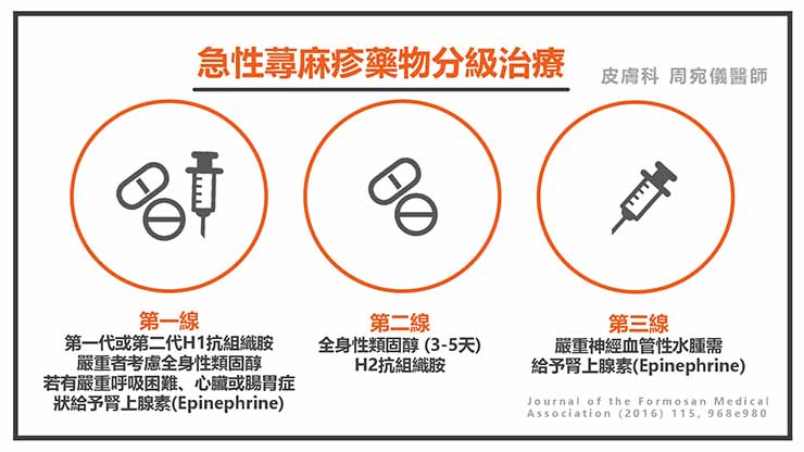 慢性蕁麻疹治療會依嚴重度與醫師臨床判斷來調整用藥,主要可以分成四級。