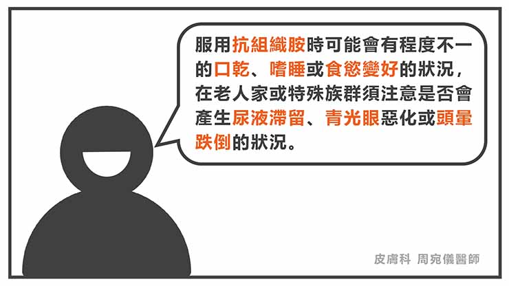 服用抗組織胺時可能會有程度不一的口乾、嗜睡或食慾變好的狀況,在老人家或特殊族群須注意是否會產生尿液滯留、青光眼惡化或頭暈跌倒的狀況。