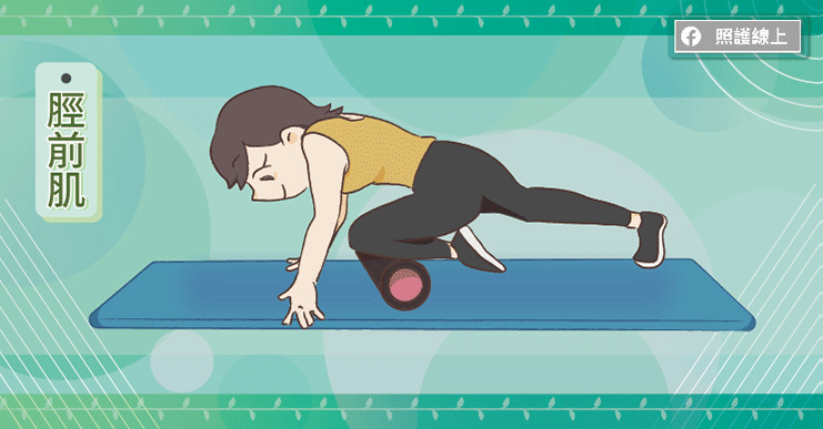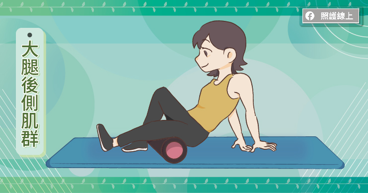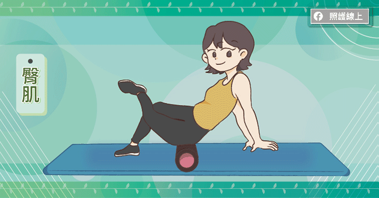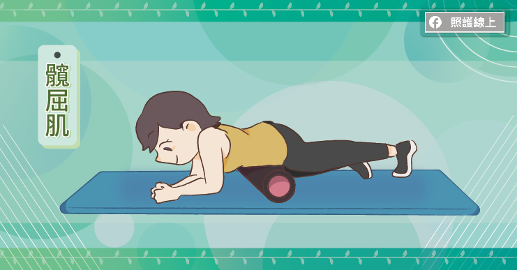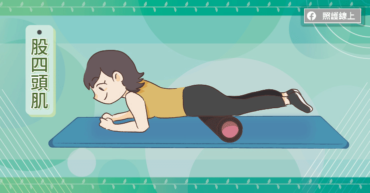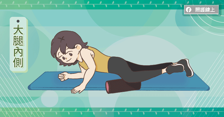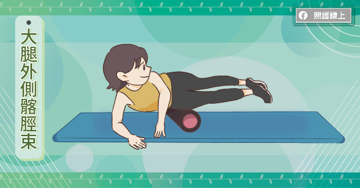 當大家練完股四頭肌之後,兩手肘繼續撐地,讓右腳彎曲著地,將滾筒往左大腿上方移動一下,使滾筒位在左側髖部下方,開始滾動。