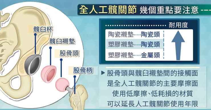 「髖臼襯墊」:相當常見的是塑膠襯墊,過去是用聚乙烯來製作,但在反覆摩擦之後可能出現碎屑,導致併發症,所以發展出多種高耐磨聚乙烯來改善。後續又開發出陶瓷材質的髖臼襯墊,陶瓷是生物相容性高、且相當安定的材質。
