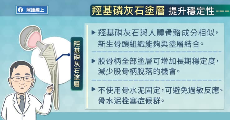 羥基磷灰石塗層與人體骨骼的成分相似,有良好的生物相容性,在骨頭復原癒合的過程中,新生骨頭組織能夠與羥基磷灰石塗層結合。股骨柄全部塗層可增加長期穩定度,減少脫落的機會。因為不使用骨水泥,可避免出現過敏反應、骨水泥栓塞症後群。