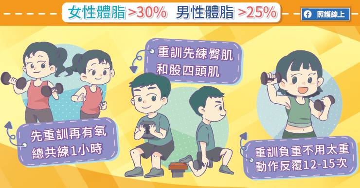 這個階段的運動過程,需要重訓和有氧兩者都做,加起來練個1小時上下。順序上建議先做重訓,消耗肌肉中的肝醣,再做有氧時才能燃燒脂肪。先做有氧,常會讓重量訓練的品質下降許多,無法獲得增肌減脂的好處。