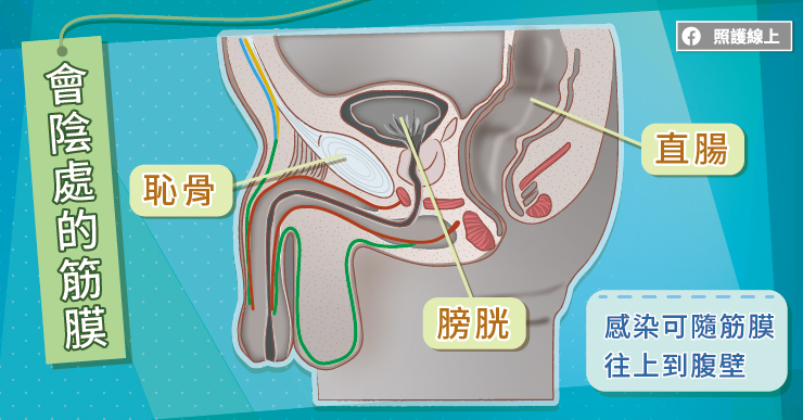 當會陰、生殖器、肛門附近藏有感染源,並免疫力低落時,微生物可以不斷增生,附近組織缺血、壞死,在會陰處表淺和深層的筋膜隨之受到影響,只要隨著筋膜延伸,感染可以快速地進展。下圖中,綠色、紅色、藍色、黃色的線都是筋膜層,可以看到在會陰附近的綠色和紅色的筋膜層若感染了,感染可以往上隨著藍色黃色的筋膜到腹部去。