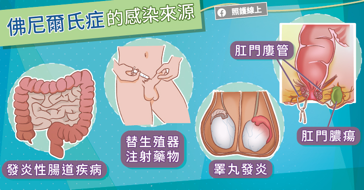 為什麼在生殖器、肛門、會陰附近會出現壞死性筋膜炎呢?主要還是因為感染。因此,假使患者出現了在生殖器附近的感染源,再加上本身免疫力不佳,就可能演變成佛尼爾氏症。