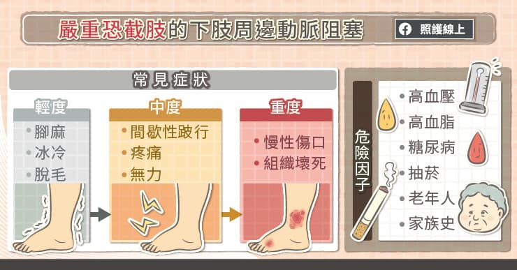 李政翰醫師說,動脈阻塞更嚴重的話,患者連坐著、躺著休息時,都會感到下肢痠痛,嚴重影響生活品質。由於血液循環太差,組織無法修復,患者下肢會出現難以癒合的慢性傷口,容易遭到感染,甚至末梢的趾頭會發紺、壞死。