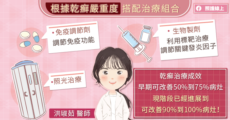 中山附醫皮膚科劉親穎醫師補充,該治療原理是類似標靶治療概念來調節關鍵發炎因子,患者約一至三個月定期回診、規律接受治療,來達到理想的治療目標。據目前健保給付規範,乾癬患者如經過照光治療及其他口服系統性治療無效,且符合全身慢性中、重度乾癬,即可申請生物製劑治療。