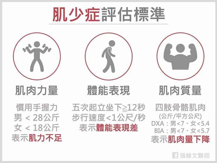 • 肌肉量下降、肌力不足、體能表現差:嚴重肌少症