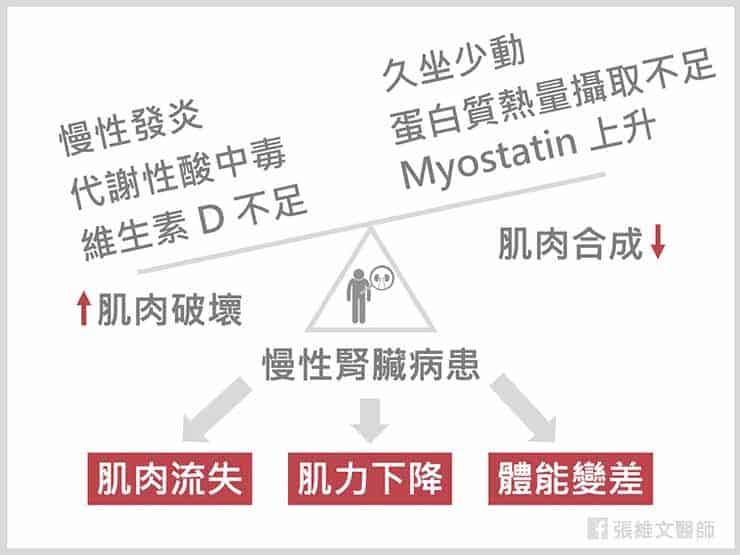 隨著腎功能變差,腎臟移除掉酸性代謝廢物的能力也變差,病人易出現代謝性酸中毒,進一步加速身體結構蛋白的破壞與分解;病人可能因尿毒導致食慾不振,進食量大不如前,或遵從醫囑採取「低蛋白質飲食」,矯枉過正,蛋白質與熱量的總攝取量過低,也會不利肌肉的修復與合成。