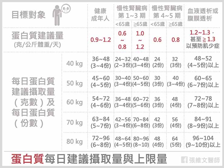 依腎功能高低,各族群的蛋白質建議攝取量如下表: