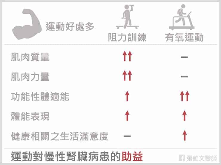 另一篇系統性文獻回顧與統合分析的研究論文也得到類似結論:慢性腎臟病第三期至第五期的病人(腎絲球過濾率低於 60 ml/min)接受漸進式的阻力訓練後,不論是肌力、生活品質、或下肢肌肉的橫截面積,皆有獲得提升。