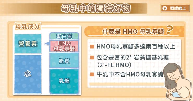 根據成分分析,母乳中包括水、蛋白質、寡醣、脂質、乳糖等,其中母乳寡醣(Human Milk Oligosaccharides, HMOs)是母乳裡面的第三大的成分,在寶寶成長過程中扮演了重要免疫功能的角色。