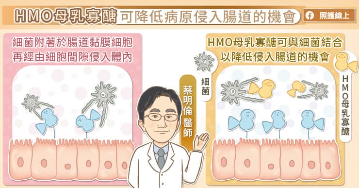 第一,進入腸胃道的HMO母乳寡醣,可以當成誘餌,病毒、細菌會直接跟HMO母乳寡醣結合在一起,壞菌較不會附著腸道的上皮細胞並侵入寶寶體內。
