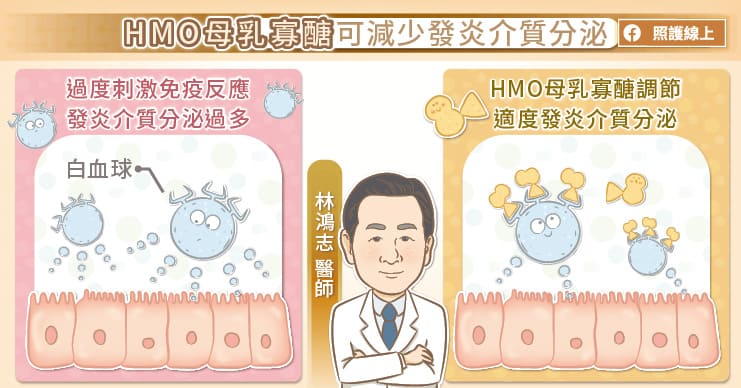 第二,HMO母乳寡醣屬於益菌生,能夠幫助腸道菌叢生長。腸道的好菌數量夠多,較能避免壞菌過度繁殖。「母奶很特別,裡頭有益菌生,也有益生菌。益菌生即HMO母乳寡醣,而益生菌主要是比菲德氏菌(Bifidobacterium species)為多,HMO母乳寡醣可以幫助比菲德氏菌生長。」林鴻志教授分享,「早產兒的壞死性腸炎(Necrotizing Enterocolitis,NEC)是一種腸道嚴重受損的急症,與寶寶腸道尚未發育成熟、腸黏膜損傷、細菌感染、腸道發炎物質等因素有關,我們的研究發現,多元化健康腸道菌叢可以減少早產兒出現壞死性腸炎的機會。」