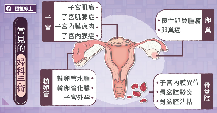 台北長庚紀念醫院婦產部蕭啟信醫師解釋,常見的婦科手術有幾類,以子宮方面來說,較常見的是子宮肌瘤、子宮肌腺症、子宮內膜瘜肉、子宮內膜癌、子宮頸癌等;卵巢方面則是良性卵巢腫瘤、卵巢癌等;輸卵管方面包括輸卵管水腫、輸卵管化膿、子宮外孕等;部分患者可能因為下腹不適、經痛、異常出血、沾黏等問題,而需要進一步做相關的婦科手術處理。