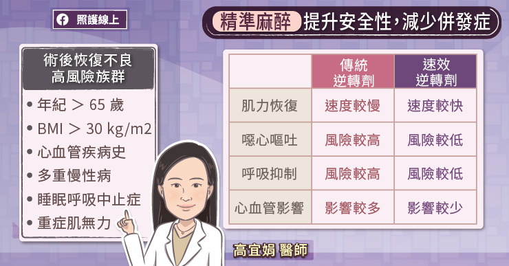 另外,傳統逆轉劑可能導致一些副作用,如氣管收縮、心跳加速,因此不適合用於氣喘、心律不整、青光眼的病患;至於速效逆轉劑,對心血管影響較小、呼吸抑制風險較低,出現噁心、嘔吐的機會也降低許多。