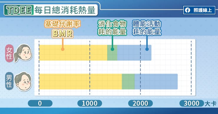 所有不同的器官、組織會有不同的需求,而我們活著,就需要讓這些器官組織都能維持正常運作,因此需要能能量。這個能量就被稱為「基礎代謝率」,英語為basal metabolic rate,簡稱BMR。基礎代謝率與每個人的身體組成(瘦肉和肥肉各佔了多少比例)、年紀、基因、性別等都有關係,如果你想要先算一下自己的基礎代謝率,請先看「BMR、TDEE-減重必讀!基礎代謝率懶人包」,記得按下線上計算機的部分做計算喔。