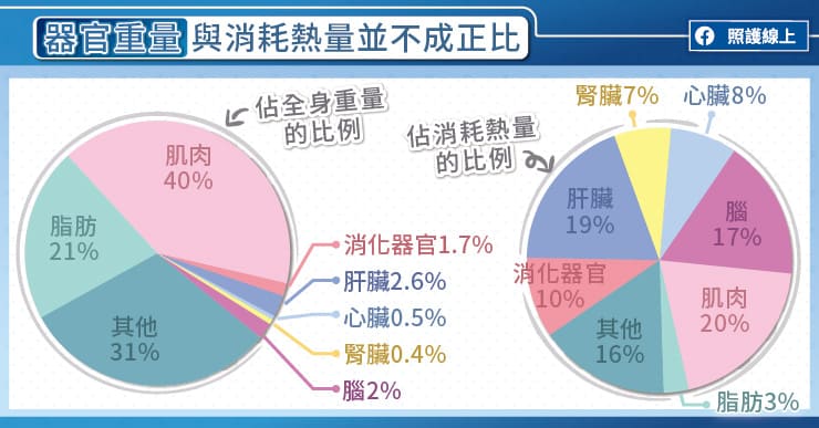 不過,就算算完了,你可能還是覺得基礎代謝率的概念有點模糊,懷疑:「究竟什麼事情正在耗去能量」?原來,光是「思考、想事情」就在耗能,腎臟製作出尿液,心臟每分每秒的跳動,都在耗能。事實上,我們的基礎代謝率BMR用了超過一半的能量在維持四個主要的器官運作,分別是大腦、肝臟、心臟、腎臟。(請看下圖的右側,代表各器官佔BMR的比例)