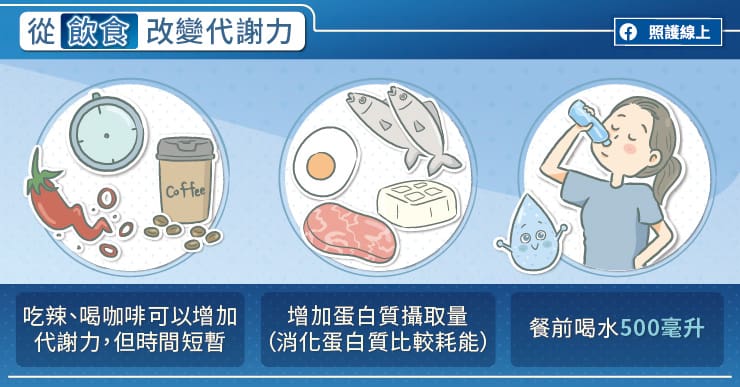 ◆ 消化食物時耗去的能量 → 增加飲食中蛋白質的比例、餐前多喝水