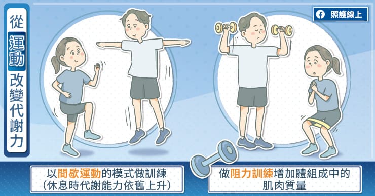 體能活動中,最有辦法增加代謝力的就是做「高強度間歇訓練」。間歇運動是種運動模式,例如每運動20至30秒,休息10秒,連續做個4到7分鐘。雖然做間歇運動的過程中,並不會比持續運動燃燒更多的熱量。但間歇運動能提高「運動之後」,也就是休息時間時的新陳代謝,讓人即使在運動後幾小時的休息狀態,燃燒的熱量也會比平常略高。