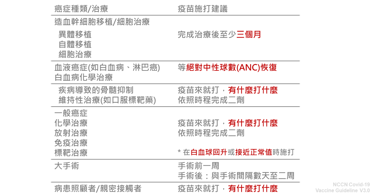 另外,還有一個很重要的觀念是:癌症患者的照顧者以及同住親屬,如果符合指揮中心開放施打疫苗的條件,也都應該儘速施打疫苗,才能給癌症患者更好的保護。