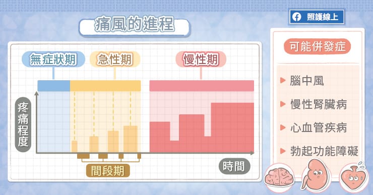 經過治療後,關節疼痛會緩解,屬於間段期(intercritical gout)。倘若沒有好好控制讓尿酸達標,痛風將反覆發作,發作的頻率會增加,持續的時間也會拉長。