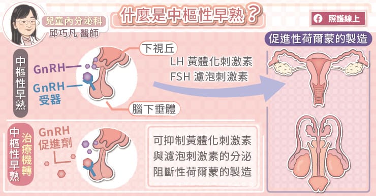 林口長庚醫院/新北市立土城醫院/新竹東元綜合醫院兒童內分泌科邱巧凡醫師表示,GnRH促進劑用來治療中樞性早熟的作用原理是,藉GnRH促進劑與腦垂體前葉之GnRH受器相結合,經由去敏感化的機轉,達到抑制下游黃體化刺激素與濾泡刺激素的分泌,進而阻斷性荷爾蒙的製造,讓孩童過早開啟的青春期之路暫緩前行。