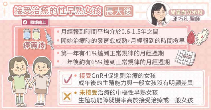 邱巧凡醫師說,據2016年義大利研究團隊的一篇回顧性文章,28篇相關研究中,追蹤這些中樞性早熟治療的兒童至成年(年紀最大者為56歲),所有特發性中樞性早熟兒童接受GnRH促進劑治療,停藥後100%會出現月經。